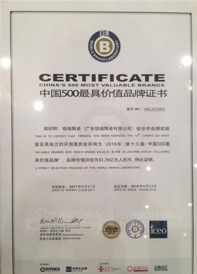 6月22日,第十三屆世界品牌大會在北京中國大飯店隆重舉行,恒福陶瓷市場部經(jīng)理李瑋應(yīng)邀出席了峰會。在峰會上,由世界品牌實(shí)驗(yàn)室評定的2016年《中國500最具價值品牌》排行榜正式揭曉,代表中國最高水準(zhǔn)的品牌國家隊(duì)陣容隆重誕生。恒福陶瓷再次榮獲“中國500最具價值品牌”榮譽(yù),品牌價值由去年的43.79億元上升到今年的51.76億元。