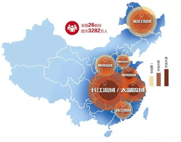 自6月30日以來,長江中下游沿江地區(qū)及江淮、西南東部等地出現(xiàn)入汛以來最強(qiáng)降雨過程。截至7月3日,全國已有26省(區(qū)、市)1192縣遭受洪澇災(zāi)害,受災(zāi)人口3282萬人,因?yàn)?zāi)死亡186人、失蹤45人,倒塌房屋5.6萬間,直接經(jīng)濟(jì)損失約506億元。