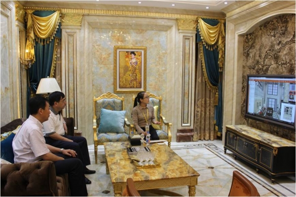 當天下午,徐金鵬社長一行人參觀了結合云商平臺打造的歐神諾陶瓷新展廳,體驗了全新的消費模式,并與歐神諾的董事長鮑杰軍進行了座談。