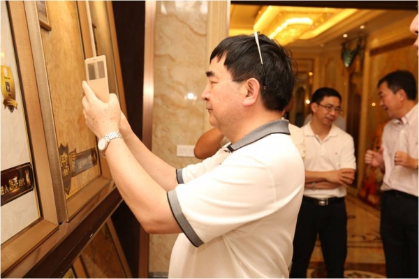 (徐金鵬社長用手機掃描瓷磚上的二維碼,了解產(chǎn)品詳情)