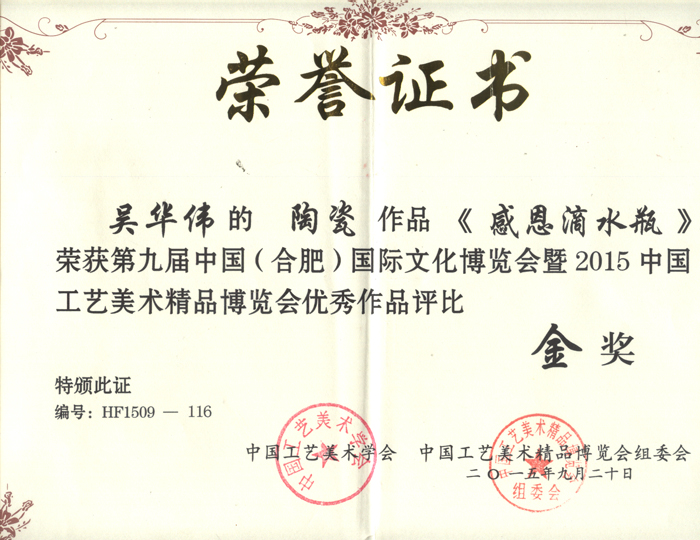 2015年9月18日,第九屆中國(合肥)國際文化博覽會在安徽合肥舉行。展會期間,中國工藝美術(shù)學(xué)會組織開展了第九屆中國(合肥)國際文化博覽會暨2015中國工藝美術(shù)精品博覽會優(yōu)秀作品評比活動,一件陶瓷作品《感恩滴水瓶》在本屆展會上格外引人注目,它以釉色典雅,開片唯美受到評委的一致好評,獲得了本次博覽會的金獎。