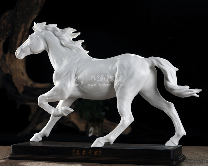 走進蔡國海的駿臨佳藝瓷研究所,映入眼簾的是各種動態(tài)的駿馬瓷塑。駿馬奔騰的雄姿、靜坐的乖巧及駿馬間的情意濃濃,展現(xiàn)得淋漓盡致。在皮膚下面,是熱血奔涌的血管,進而是塊狀的肌肉與健壯的骨架,馬的蹄、鬢毛、眼神、耳朵、乃至鼻息,都傳遞出濃烈的信息,具有很強的藝術感染力。
