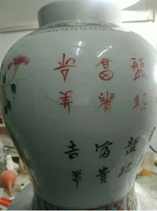 第三步是待古瓷拼裝完整后,再做底色化妝及畫青花等彩色和上釉。釉是一種新型仿釉涂料,如聚酯等。上完釉后器物表面光亮,硬度高,裝飾性強。有時口沿的青花直線,它中間深、二邊淡,有如國畫的墨韻,若隱若現(xiàn),虛中有實。他說在處理口沿時,應(yīng)選擇手工描與機械噴的工藝相結(jié)合,才能做到天衣無縫。最后是用地板蠟罩光。經(jīng)修復(fù)后的古瓷,光彩如初,重現(xiàn)原貌。