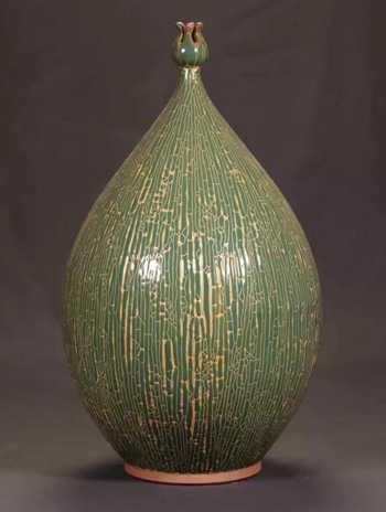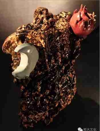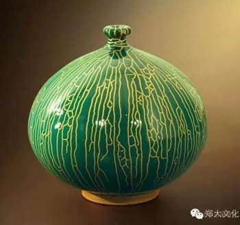 三是他的作品彰顯出深厚的文化意蘊。他視野開闊,不僅從中國文化和中原文化中選取素材,而且從傳統文化和民間文化中汲取靈感。從盤古開天,女媧補天這樣的遠古神話,到雙連壺、雙魚尊,再到羊、雞、葫蘆、桃,以及達摩、鐘馗等。每個文化符號的選擇與創(chuàng)意,每一件藝術作品的內涵與形式都顯示出獨特的文化追求。比如豆豆壺,造型圓潤可人,小口鼓腹,彰顯的是少說多做,守口如瓶、大度包容的多重意蘊,體現的是包容萬物的博大胸懷和氣度。在釉色創(chuàng)新上,“金鑲翠”打破了傳統“天青月白”的凝固程式和千瓶一“紅”的單調,以“綠色”為主調,造型變化萬千,強調“和平、發(fā)展、生命、環(huán)保”的主題,與時代發(fā)展相吻合,生生不息。他的作品因內容與形式的獨特創(chuàng)造真正達到了觀賞性與藝術性的統一?偸潜荒7拢珱]能超越。