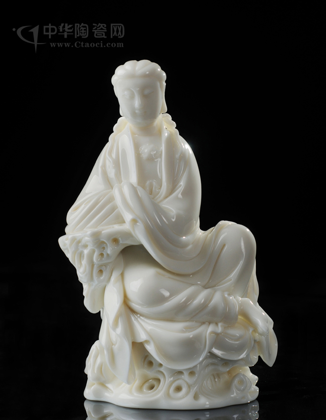 這尊觀音作品以廈門南普陀寺收藏的一代瓷圣何朝宗作品《坐巖觀音》為原型制作。作品采用孩兒紅實芯堆塑而成,觀音容顏端莊秀麗,神情和藹慈祥又超凡脫俗。讓人賞心悅目,一見傾心,極具藝術(shù)魅力。她完美地融合了德化瓷在質(zhì)感和雕塑工藝的精華:如脂似玉、形象傳神。