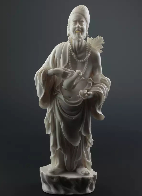 引福歸堂,福壽康寧,;垭p至,福澤生輝。彌勒形象笑容可拘,慈善為懷。坦胸露擘,露中有藏,半露半藏,藏露得體。衣紋疏密有致,自然流暢。身體微微向前走來(lái),不但使人覺(jué)得有親和感,而且動(dòng)靜相生,栩栩如生,足見(jiàn)大師在創(chuàng)作時(shí)獨(dú)運(yùn)匠心