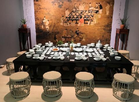 仿古瓷展區(qū)展出了包括宋景德鎮(zhèn)窯青白釉弦紋瓶、元青花魚藻紋大盤、明成化斗彩龍紋盤等200余件仿古精品,其中曾拍出2.3億天價的元青花鬼谷子下山大罐和2.8億港幣的明成化斗彩雞缸杯等高仿制品,維妙維肖,令人嘆為觀止。景德鎮(zhèn)的高仿瓷生產至少可以追溯到明代早期,如永樂御窯生產的仿龍泉青瓷,最典型的當屬明成化、清康雍乾三代大量的仿宋官窯、哥窯和龍泉窯瓷器。此次展覽主要集中的是元明清三代的高仿瓷,從景德鎮(zhèn)有影響力的仿古瓷生產廠家遴選而來。記者還注意到,展區(qū)內依據宋徽宗趙佶《文會圖》畫境布設的仿古青白瓷茶會場景別具一格,充分顯示了中華瓷茶文化相通相融的極致風姿。