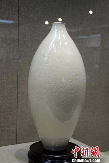 陳文增代表性作品《定窯三聯(lián)藝術(shù)牡丹紋刻花貴妃瓶》。 于俊亮 攝