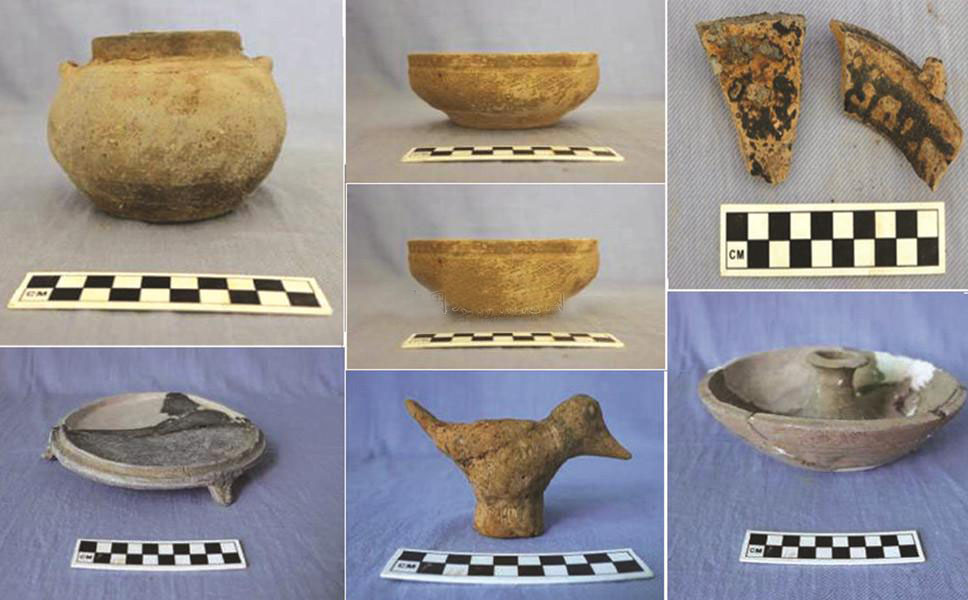 出土遺物以陶器為主,另有瓷器、窯具、磚、瓦等,共收集陶瓷片等200余袋,完整及可修復(fù)的小件器物100余件。陶器多為泥質(zhì)灰陶,火候較低,器類有罐、盆、碗、燈盞、刻槽盆、甑等,另有雞、鴨、羊等家禽家畜模型。瓷器以醬釉為主,亦有青黃釉,胎釉結(jié)合較差;胎土細(xì)膩,胎質(zhì)較為堅(jiān)硬,胎體為褐色或白色;器類有碗、盤口壺、罐等,部分帶釉的器物,將釉剝離后,與陶器無(wú)異,當(dāng)為低溫釉陶器。