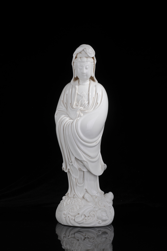 簡介:該《渡海觀音》由中國青年陶瓷藝術家設計制作,以德化特有的溫潤如玉的“中國白”為胎質,純手工制作,作品圓勁有力如凝脂似玉,滋潤瑩滑,神情嫻雅平靜,安詳自若,雙目低垂凝思,衣紋線條清晰、簡潔、瀟灑,多變化,柔媚流暢,翻轉自然,觀音雙手藏袖,露一足踏蓮花,另一足水花掩蓋,作踏浪凌波渡海之勢刻畫的栩栩如生。經高溫1300多度燒制,整尊造像美倫美煥,活靈活現(xiàn),是一件上乘之品。
