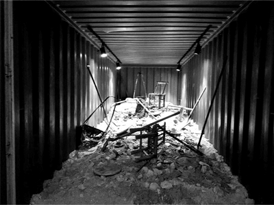 一個集裝箱,內有一方土堆,各式制瓷工具無規(guī)則擺開,原始、粗糙與凌亂……