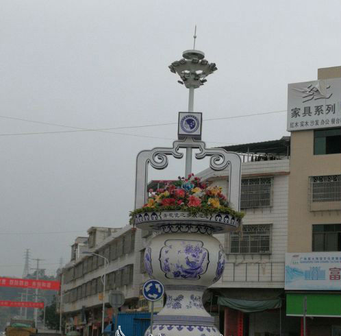 為推進品牌建設,該縣統一標識,積極實施名標、名牌戰(zhàn)略工程,通過政策扶持,引導和鼓勵陶瓷企業(yè)制定產業(yè)聯盟標準,統一使用“大埔陶瓷”商標。目前,已有第一批22家陶瓷企業(yè)申請使用“大埔青花瓷”地理標志產品專用標志。為更好地提高大埔青花瓷的知名度和美譽度,打造大埔陶瓷主產區(qū)形象標志,形成大埔青花瓷區(qū)域特色,推動大埔青花瓷品牌建設,大埔縣日前在該縣最早的陶瓷產地、被譽為“白玉城”的大埔陶瓷主產區(qū)高陂鎮(zhèn)主要交通要道高陂中學門旁的十字路口圓盤,設立了大型青花瓷花籃(如右圖)。該圓盤花籃高9.4米,圓最大直徑4.5米,共分三層,第一層主要是以植被為主的綠化帶,寓意春意盎然、百花齊放;第二層是以多個具有特色的青花瓷成品(玻璃鋼替代品)簇立在花草之上,環(huán)繞中心,向人們展示不同種類、風格的青花瓷;第三層則是花籃,傲立中心,充分展示出青花瓷賞心悅目、淡雅脫俗的特點。