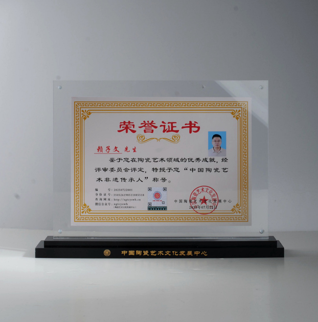 賴子文,中國陶瓷藝術(shù)非遺傳承人、中國當(dāng)代工藝美術(shù)大師、高級(jí)工藝美術(shù)大師、福建省工藝美術(shù)師、中國陶瓷藝術(shù)文化發(fā)展中心會(huì)員,福建省德化縣匯瓷窯陶瓷有限公司藝術(shù)總監(jiān)。