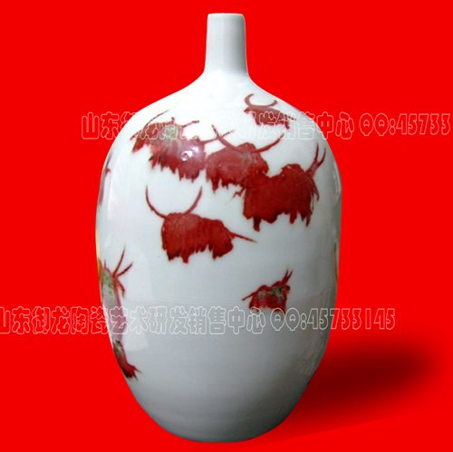 拉坯手繪釉里紅——紅牛瓶 特點(diǎn):1.肚圓充盈,首口高聳,上下串通,神氣膘豐。2.釉色瑩潤(rùn),紅中泛綠,融合之相。角碩體壯,宏發(fā)之兆。用途:1.作裝飾瓶,造型簡(jiǎn)潔流暢,形象張揚(yáng)生動(dòng)。靜中寓動(dòng)。2.作燈座,以穩(wěn)健之紅光碩牛為基礎(chǔ),穩(wěn)重有內(nèi)涵,外形內(nèi)寓,渾然天成。